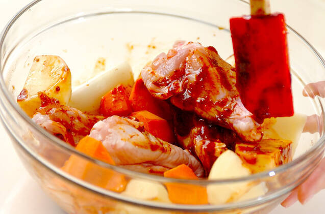 ボウルで<合わせ調味料>の材料を混ぜ合わせ、鶏手羽元とジャガイモ、ニンジン、玉ネギを入れてからめ、炊飯器に入れる。