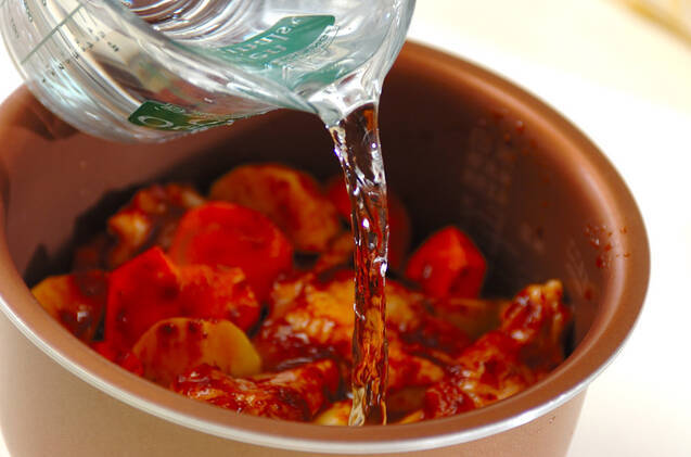 (1)に水を入れ、スイッチを押して1時間炊飯する。竹串を刺し、野菜が柔らかくなったらOK。