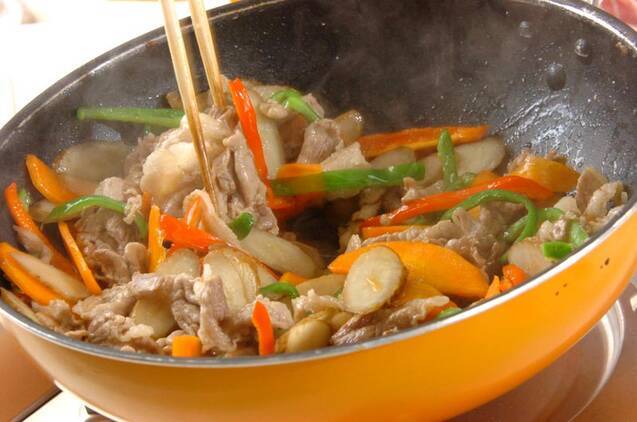 みりん、砂糖を加えて炒め、しょうゆ、作り置き甘酢を加えて、ピーマン、赤ピーマンを加えて炒め合わせ、汁気がほとんどなくなるまで炒める。器に盛ってコショウを振りかける。