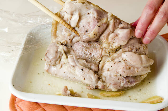 1の鶏肉を、電子レンジで5分加熱する。鶏肉をひっくり返して更に3~4分加熱する。粗熱が取れれば、鶏肉を食べやすい大きさに切る。蒸し汁は<合わせダレ>に加えるので残しておく。