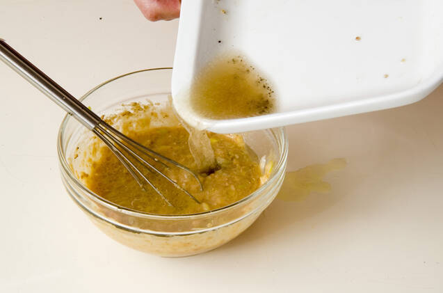 <合わせダレ>のショウガは皮をむいてみじん切りする。白ネギは縦に何本か切り込みを入れて小口からみじん切りにしする。他の材料、3の蒸し汁と混ぜ合わせる。器に小松菜を敷き、鶏肉を並べ、<合わせダレ>をかける。刻みミツバを散らし、カボチャを添える。