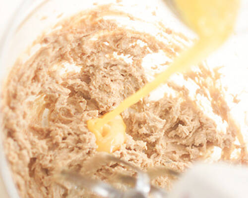 割りほぐした卵を2~3回に分けながら加え、そのつどよく混ぜ合わせてなめらかにする。