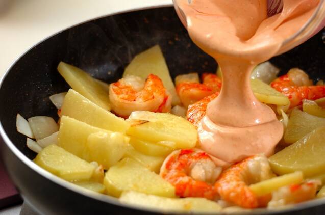 野菜が透き通ってきたら、塩コショウをしてエビを加え、エビの色が赤く変わったら<調味料>を加える。全体に馴染んだら火を止め、器に盛る。