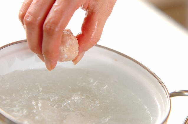 <つくね>の材料をしっかり混ぜ合わせて8~12個に丸め、熱湯に入れてゆでザルに上げる。