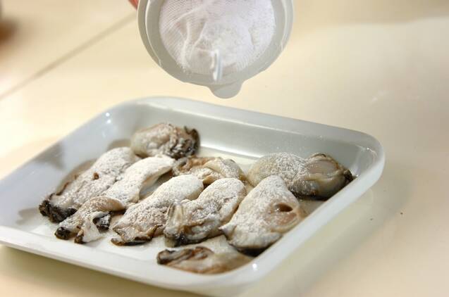 カキに小麦粉を振り、温めたフッ素樹脂加工のフライパンにオリーブ油をひいて、全体をこんがり焼く。