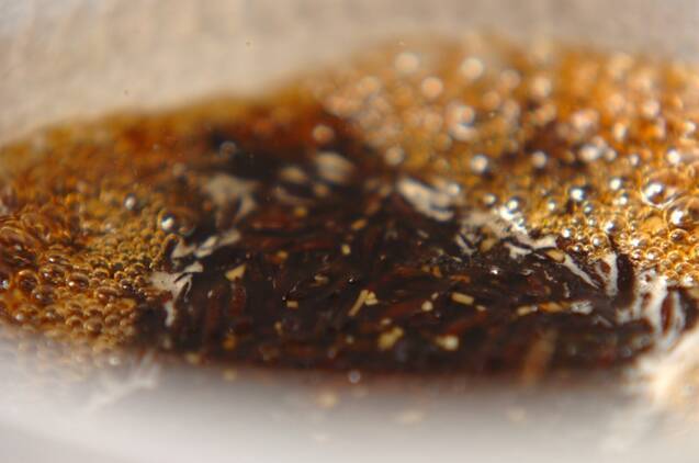 小鍋に<煮汁>の材料と、芽ヒジキ、ショウガを入れ、中火にかける。混ぜながら水分を飛ばして煮る。
