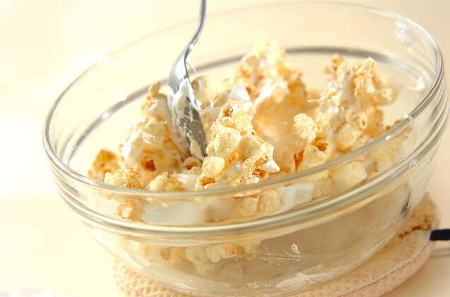 マシュマロが溶けたら、ポップコーンを加え、ぬらしたスプーンを使って混ぜ合わせる。