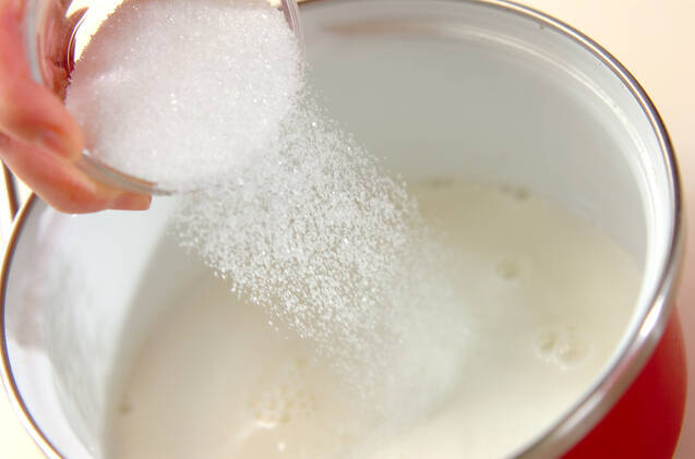 <カスタードクリーム>を作る。鍋に牛乳、バニラビーンズ、少量のグラニュー糖を加え、火にかける。