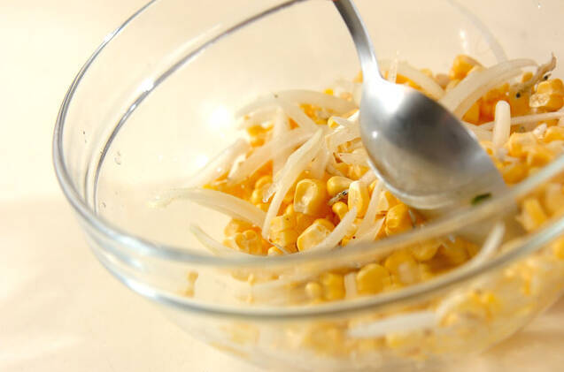トウモロコシは、包丁で粒を削ぎ落とし、ザルに入れてサッと水洗いする。ぬれたままの生トウモロコシをボウルに入れ、薄切りにした玉ネギ、チリメンジャコ、コショウを合わせる。