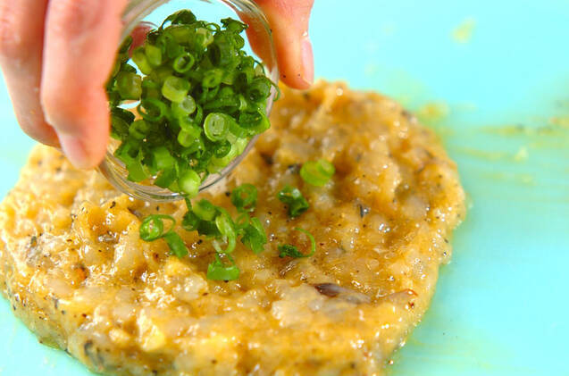 エビは包丁で細かくたたき、卵黄、コショウ、しょうゆを加えながら、包丁の側面を使って練り、粘りが出てきたらネギを混ぜ合わせる。