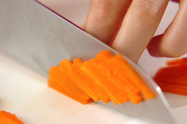 ニンジンは皮をむき、長さ3cmの細切りに切る。