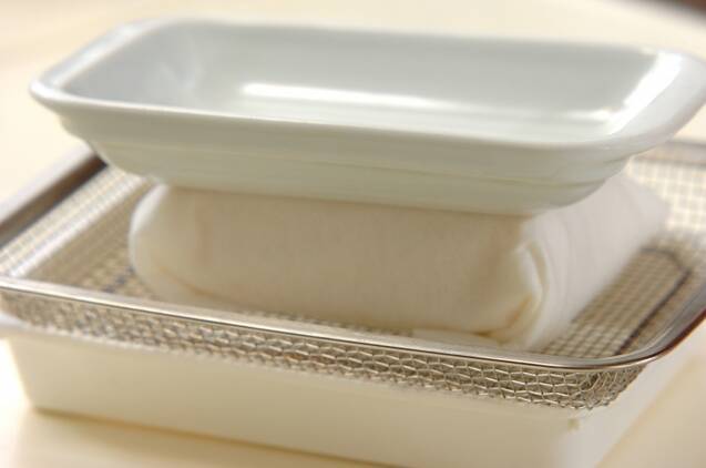 絹ごし豆腐はキッチンペーパーに包み、重しをのせて10分程水きりする。