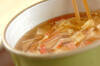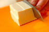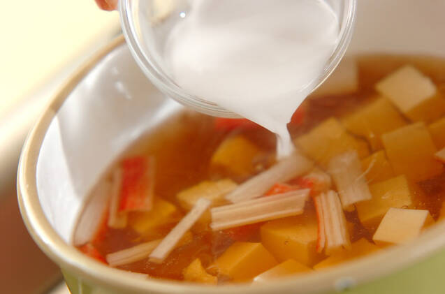 鍋にだし汁、<調味料>の材料を入れて強火にかけ、煮たったら豆腐、カニ風味カマボコを加える。<水溶き片栗>をまわし入れてトロミをつける。