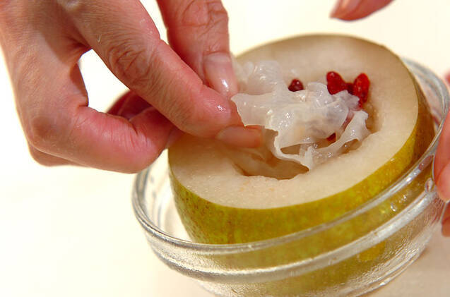 耐熱皿に梨を並べ、くりぬいた穴に白キクラゲ、クコの実、ハチミツ、水を半量ずつ入れる。