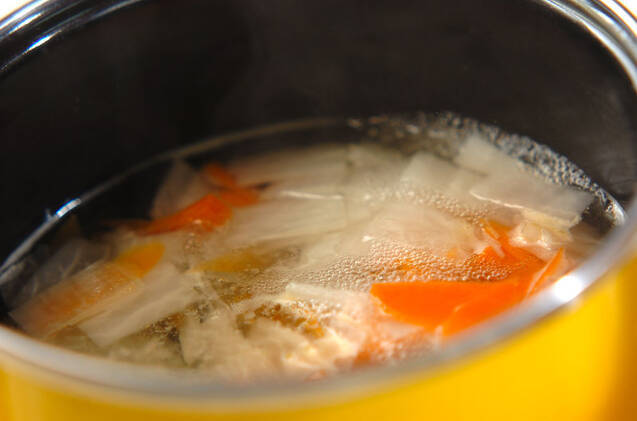鍋にだし汁、酒、塩を入れて強火で熱し、煮たったら大根、ニンジンを加える。再び煮たったら少し火を弱め、大根がしんなりするまで煮る。