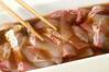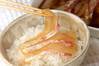 <つけダレ>を混ぜ合わせ、鯛の薄造りをつける。