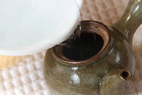 <お茶>を入れる。急須又は土瓶に熱湯を入れ温める。一度お湯を捨ててお茶の葉を入れ、沸騰したお湯を少し冷まして急須に注ぎ、蓋をして2分位おく。