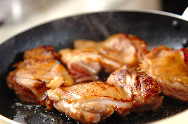 残りのサラダ油を入れ、鶏もも肉の汁気を軽くきって、皮側を下にして並べる。焼き色がついたら返して弱火にし、同様に焼き色がつくまで焼く。