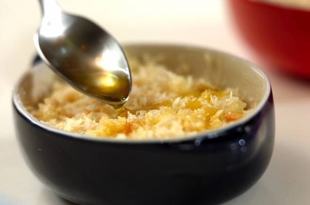 (1)にパン粉を振ってオリーブ油をかけてオーブントースターで焼き、美味しそうな焼き色がついたら取り出し、ドライパセリを振る。