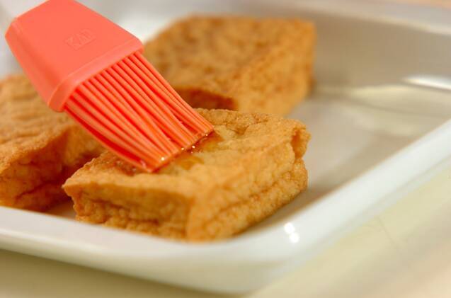 <厚揚げと蒸しナスの梅おろし和え>を作る。厚揚げにゴマ油をハケで薄くぬり、予熱したグリルの焼き網にのせ、両面に焼き色がつくまで焼き、食べやすい大きさに切る。