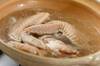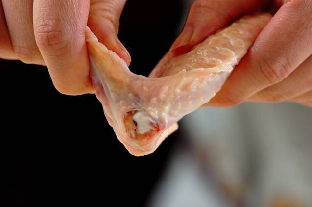 鶏手羽先は関節の部分に切れ目を入れ、関節と反対方向に折る。骨の際に切り込みを入れる。