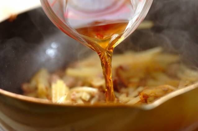 <調味料>の材料を加え、サッと炒めて火を止める。<水溶き片栗>を煮汁に混ぜて火にかけ、再び1分程加熱してトロミをつける。バット等に取り出し、冷ます。
