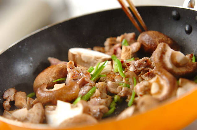 フライパンにゴマ油を入れて中火にかけ、豚肉の色が変わるまで炒め、シイタケ、ピーマンも炒め合わせる。