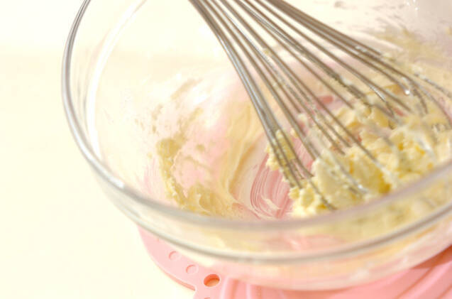 ボウルにクリームチーズを入れ、泡立て器で柔らかく練り、さらにグラニュー糖大さじ1を加えて練り混ぜる。