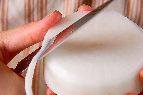 大根は6~8つの輪切りにし、皮を厚めにむき、面取りをする。水に通して、ぬれたまま耐熱容器に重ならないように並べ、電子レンジで7~8分加熱する。水に取り、サッと洗ってザルに上げる。