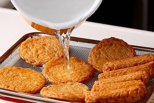 ゴボウ天、ひら天は熱湯を掛け、表面の油抜きをする。
