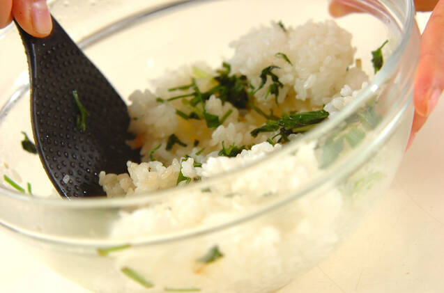 ボウルにご飯を入れ、(2)のセリを混ぜ、さらにかつお節も加えて混ぜ、お好みの大きさのおにぎりにする。