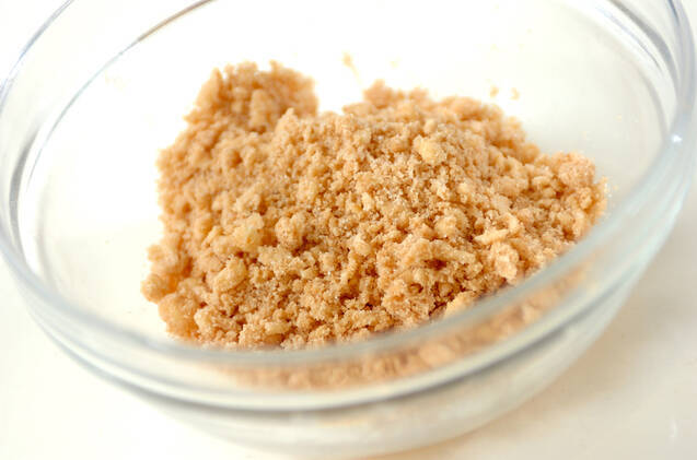 <クランブル>を作る。ボウルに薄力粉、アーモンドパウダー、シナモンパウダー、グラニュー糖、無塩バターを入れ、指先でバターをつぶして粉類をまぶし付ける。全体がポロポロになったら冷蔵庫に入れておく