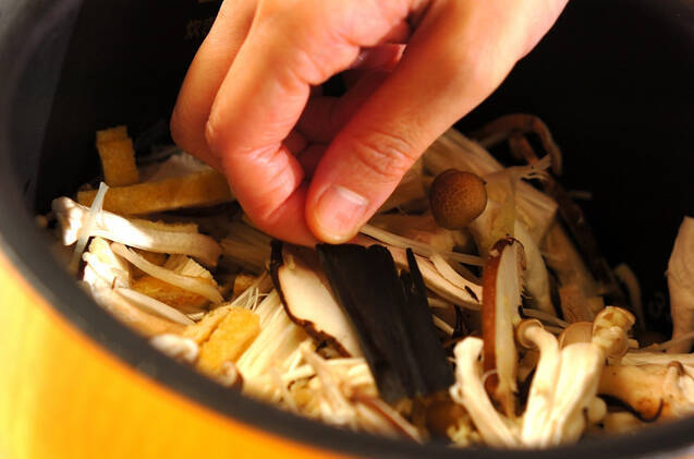 炊飯器に洗ったお米、<調味料>の材料を加え、分量線まで水を加えてひと混ぜする。芽ヒジキ、シメジ、エノキ、シイタケ、油揚げ、ショウガを入れて昆布をのせ、スイッチを入れる。