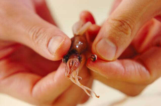 ホタルイカは目とくちばしを取り、サッと水洗いして水気をきる。