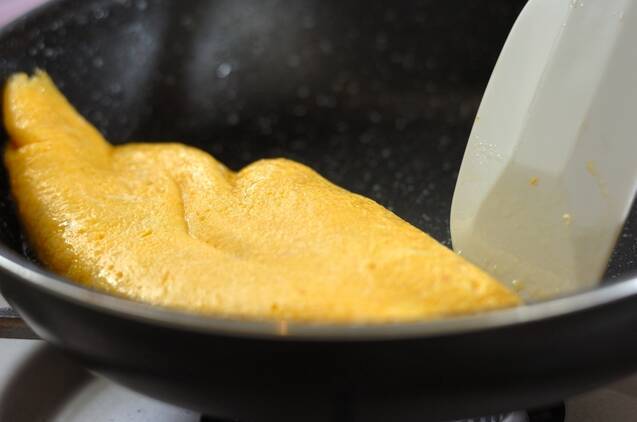 フライパンの向こう側を下げて傾け、持ち手をトントンとたたいて、オムレツを回転させながら形を整え、(2)の器に盛る。<あん>をかけ、白髪ネギをのせる。同様にもう一回繰り返す。