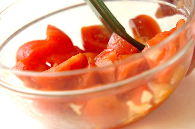 <ドレッシング>のボウルに、トマトと甘酢ショウガを加えて混ぜ合わせる。器に盛り、大葉をのせて白ゴマを振る。