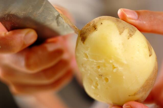 ジャガイモに竹串を通してすっと通ったら、火を止め、皮をむいて、熱いうちにボウルの中でつぶす。