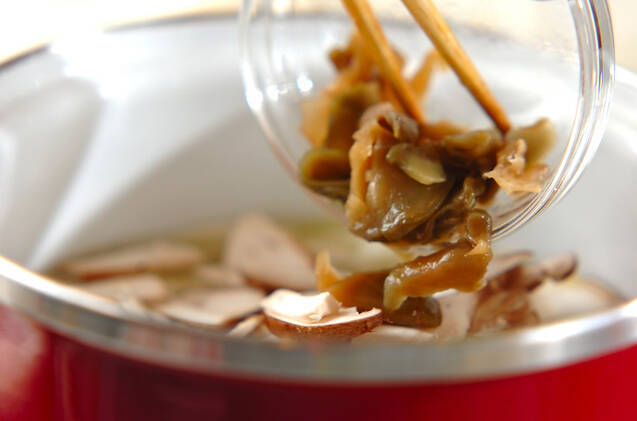 鍋に<スープ>の材料、白ネギ、シイタケ、ザーサイを入れて火にかけ、煮たったら3~4分煮る。