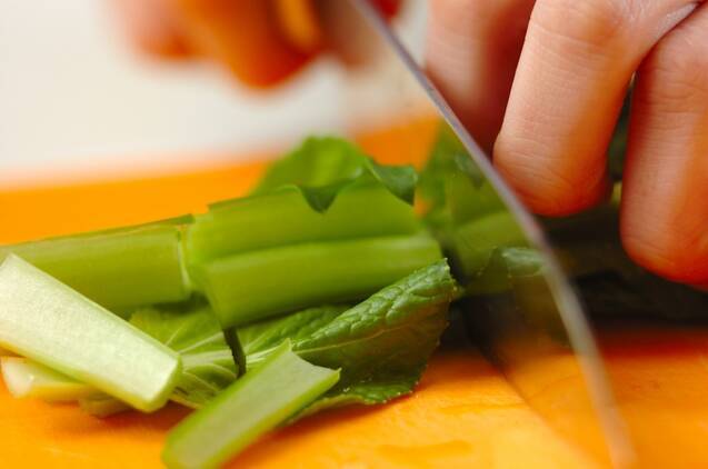 小松菜は根元を切り落とし、長さ3cmに切る。<水溶き片栗>の材料を合わせる。