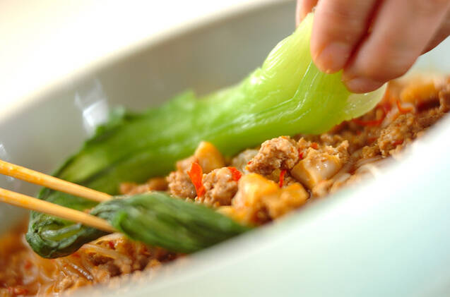 全体に火が通ったら、<調味料>の材料を加えて煮る。煮たったら春雨の入った器に注ぎ、水気を絞ったチンゲンサイをのせラー油、松の実を散らす。