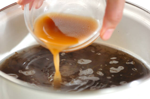 鍋にだし汁を入れて強火にかけ、煮たったらもずくを加え、再び煮たったら<調味料>の材料を加え、よく混ぜ合わせる。
