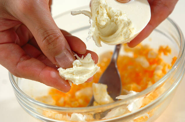 <具>のゆで卵はフォークでつぶす。モッツァレラチーズは手で細かくちぎり、ボウルでその他の<具>の材料を混ぜ合わせる。