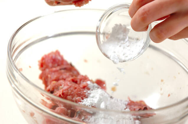 <肉団子>を作る。片栗粉以外の材料をボウルに入れてしっかり混ぜ合わせ、最後に片栗粉を加えて混ぜる。