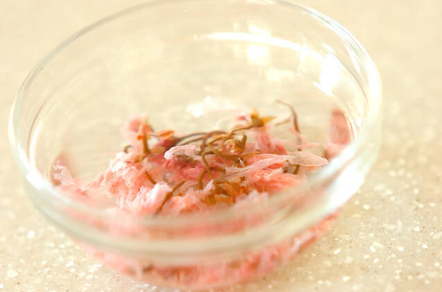 桜の花の塩漬けは流水で洗って塩を落とし、たっぷりの水に漬けて10分ほど塩抜きをする。桜の花8本分を取り分けておき、残りは細かく刻む。