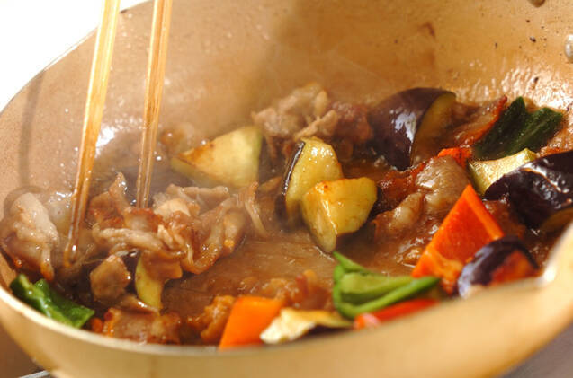 ナスがしんなりしたら、ピーマン、赤ピーマン、<調味料>を加えてからめながら炒める。