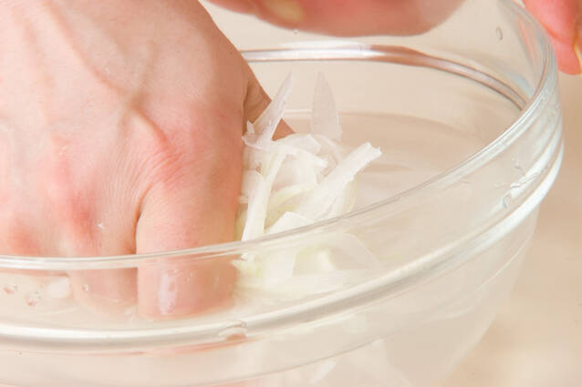 玉ネギは縦薄切りにして冷水に放ち、軽くもみ洗いして水気を絞る。サニーレタスは水洗いし食べやすい大きさにちぎる。トマトはヘタを切り落とし、食べやすい大きさに切る。
