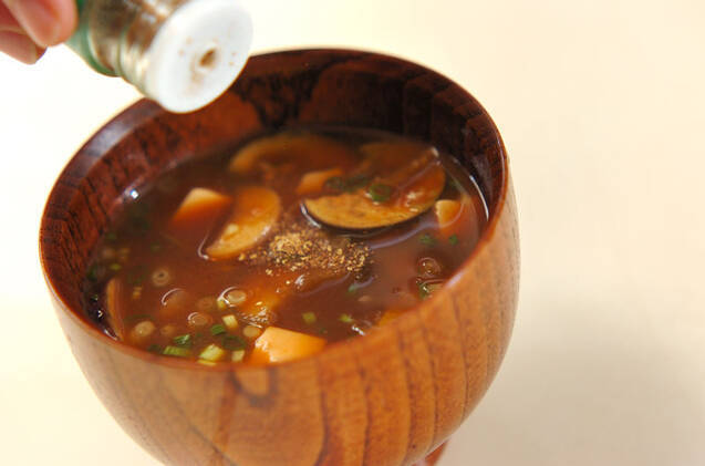 煮たつ直前に豆腐、刻みネギを加えて火を止める。器に注ぎ、粉山椒を振る。