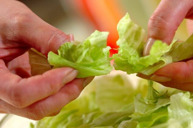 レタスは食べやすい大きさに手でちぎり、水に放つ。ザルに上げて水気をきり、抗菌のビニール袋に入れて、冷蔵庫で冷やしておく。