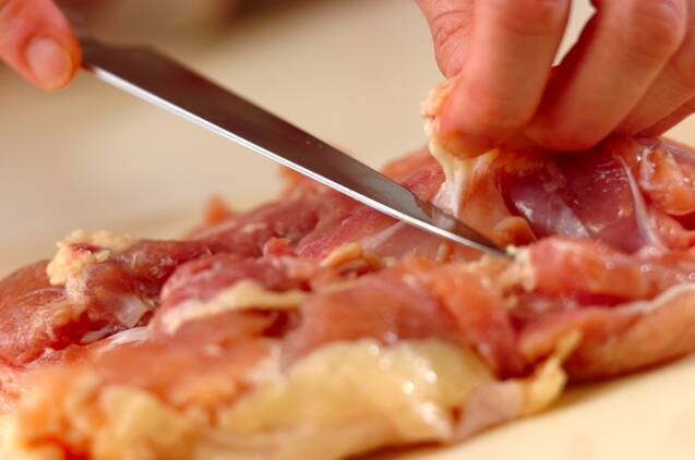 鶏もも肉は余分な脂と太い筋を取り除き、ひとくち大に切って塩をもみ込む。