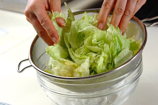 レタスは軸を押さえつけ、ねじりながら芯を取る。手でちぎって水に放ち、ザルに上げてしっかり水気をきる。(ポイント)レタスの軸を親指の付け根で押さえつけ、ねじりながら取って!